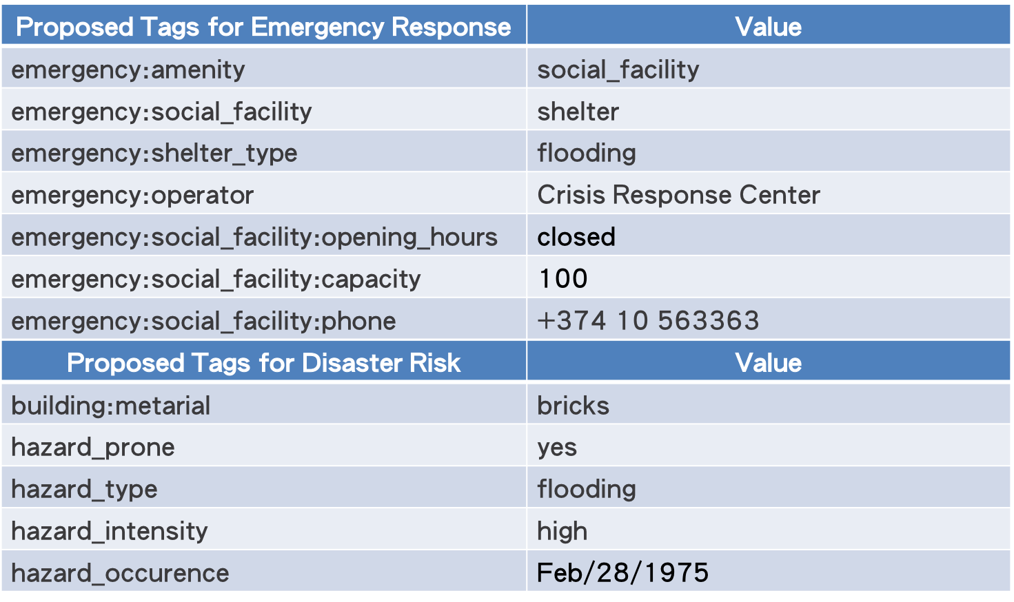 - 對台灣的防災地圖而言,鼓勵各村里長去記標在地的避難場所,而學校、活動中心常被選為災害發生時的避難中心,在與其它國際上的mappers討論後,使用 amenity=school + evacuation_center=yes 來標記,平時為學校,但災害發生時為避難中心使用。